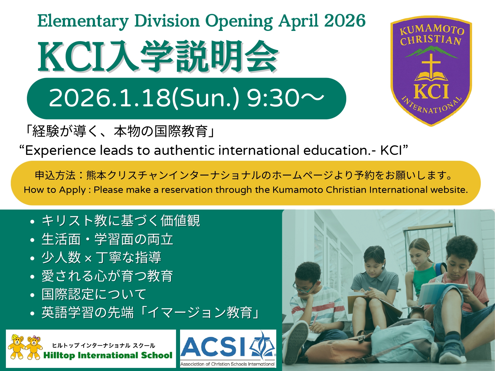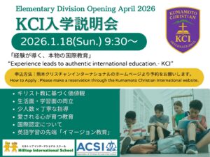 Kumamoto Christian International は、少人数であたたかな環境の中、世界水準の国際教育を提供しています。基礎的な学力と確かな英語力を育むとともに、日々の学びや体験を通じて豊かな人間性を培います。